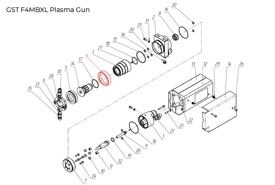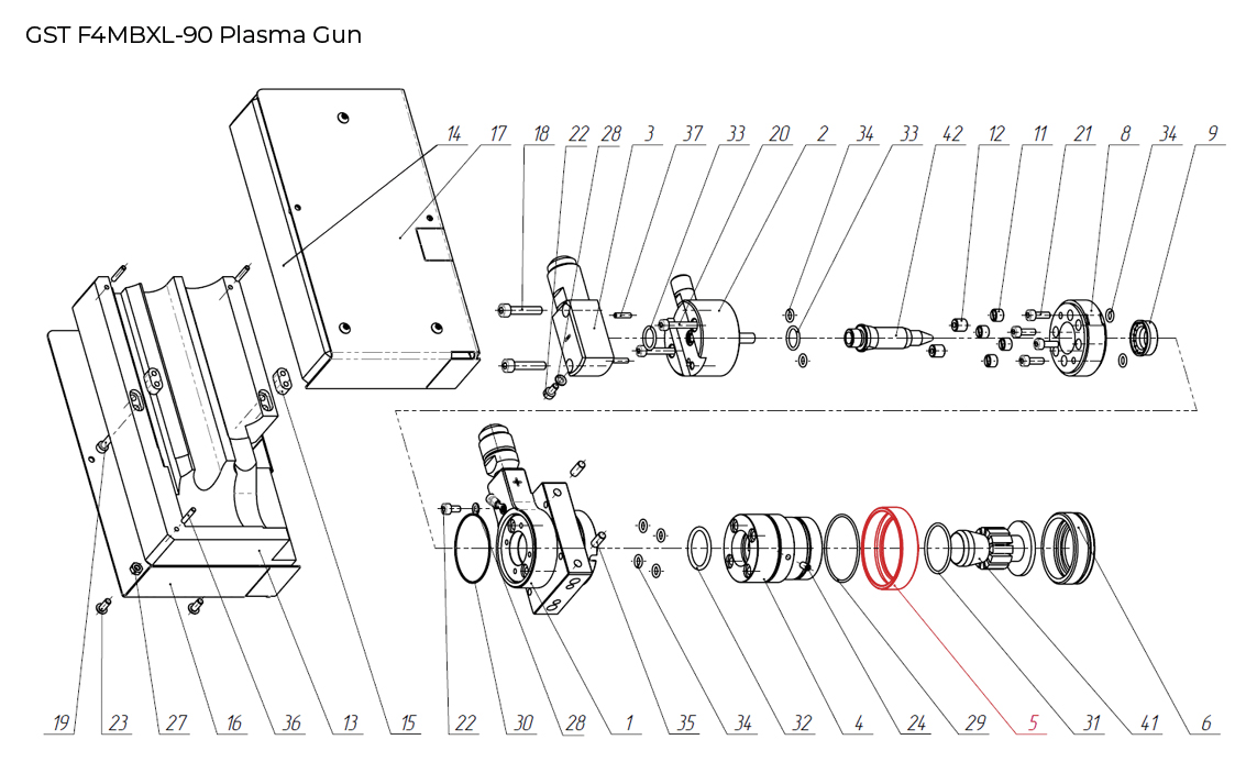 GST-100004 Rear Locking Ring is compatible with F4/F4-90 plasma gun models, on the F4 plasma gun diagram it is shown as position 4, on the F4-90 plasma gun diagram it is shown as position 5