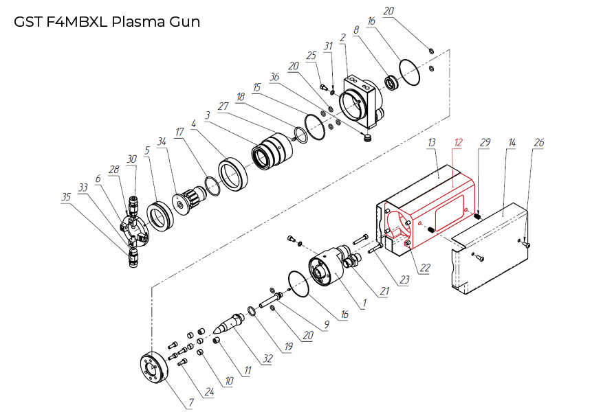 GST-100034 Cover Assembly is compatible with F4 plasma gun model, on the F4 plasma gun diagram it is shown as position 12