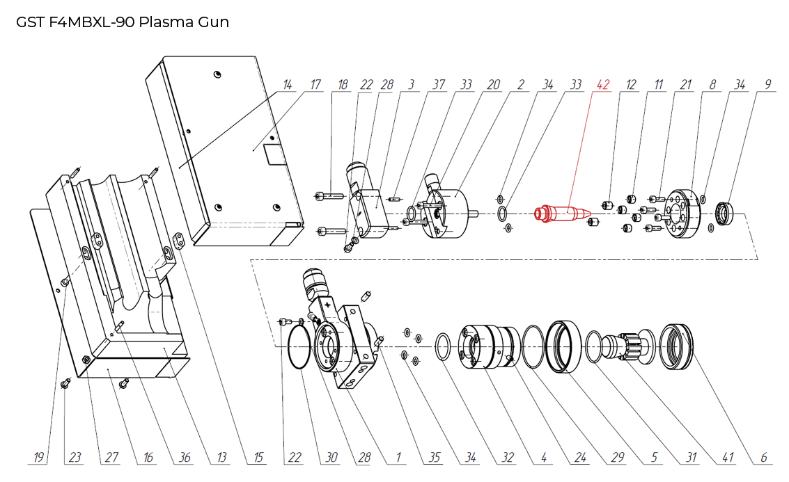 GST-100045 Electrode WCe is compatible with plasma gun models F4/F4-90, on the diagram of the plasma gun F4 it is displayed as position 32, on the diagram of the plasma gun F4-90 it is displayed as position 42